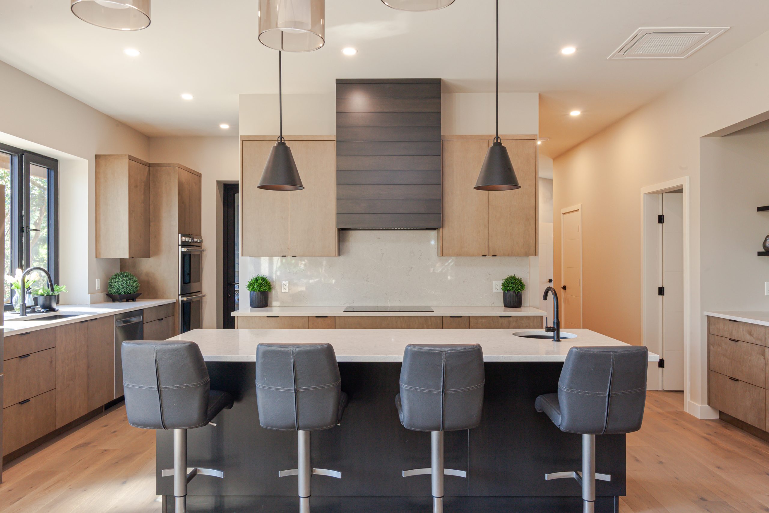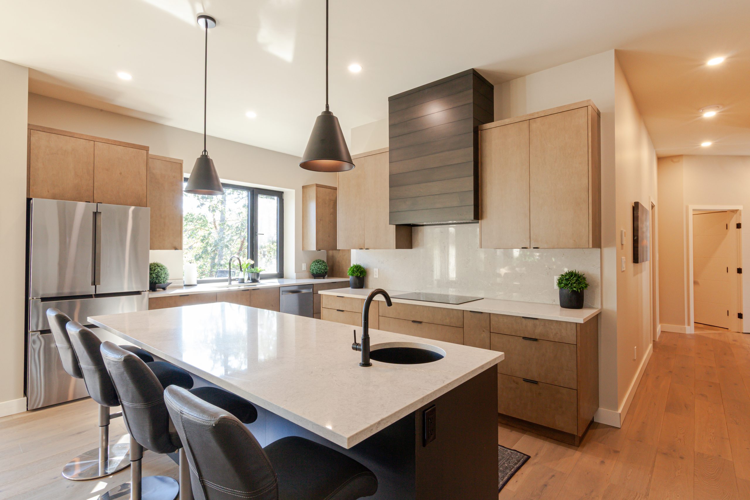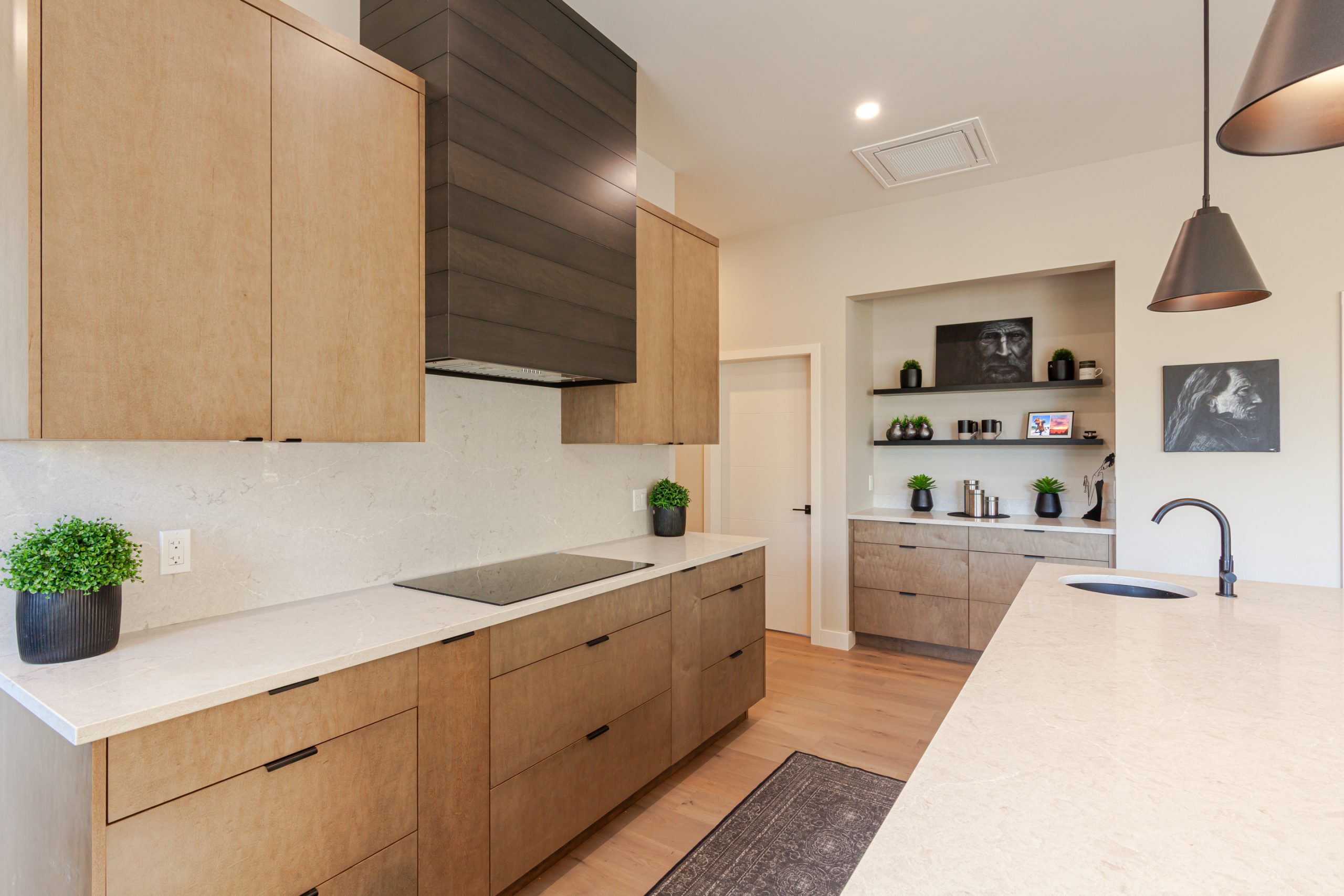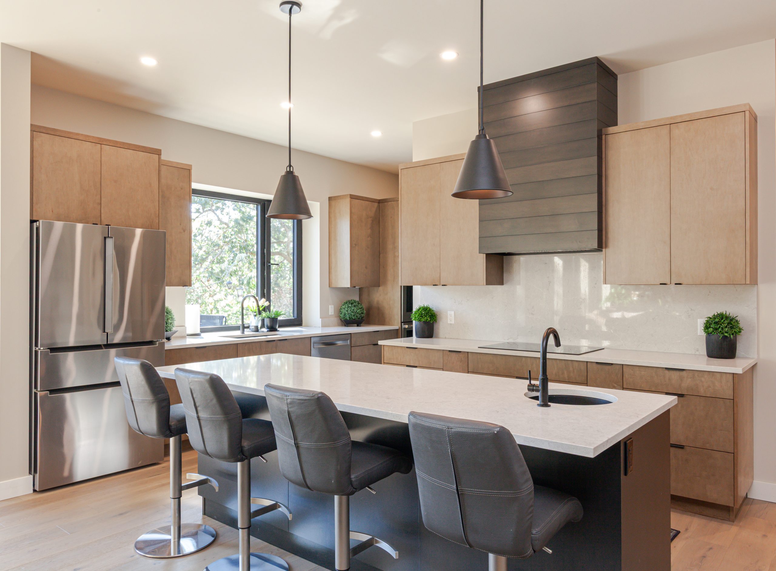 The kitchen features premium Merit cabinetry, with perimeter doors in the sleek Icehouse slab style. These are crafted from maple veneer and stained “Wicker” for a warm, natural finish. The island cabinetry is also maple, stained “Old Growth” — a tone echoed in the custom-built range hood canopy for a cohesive, elevated look.