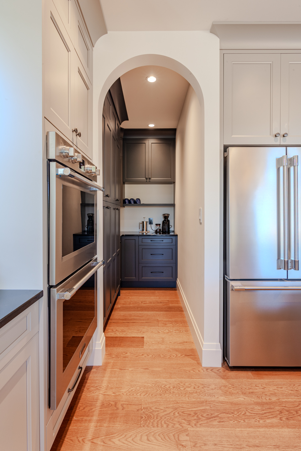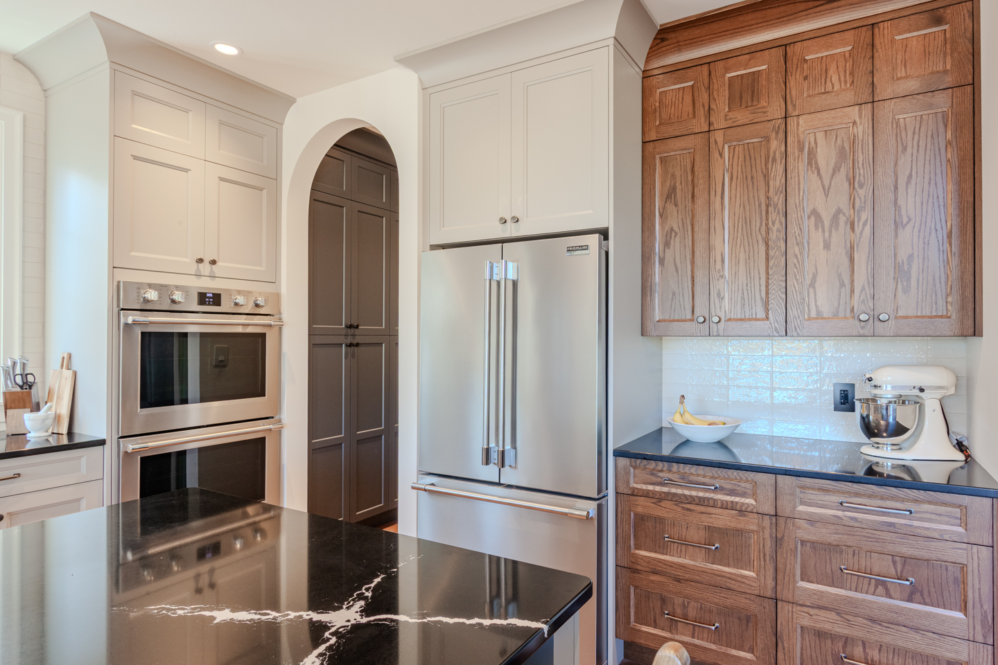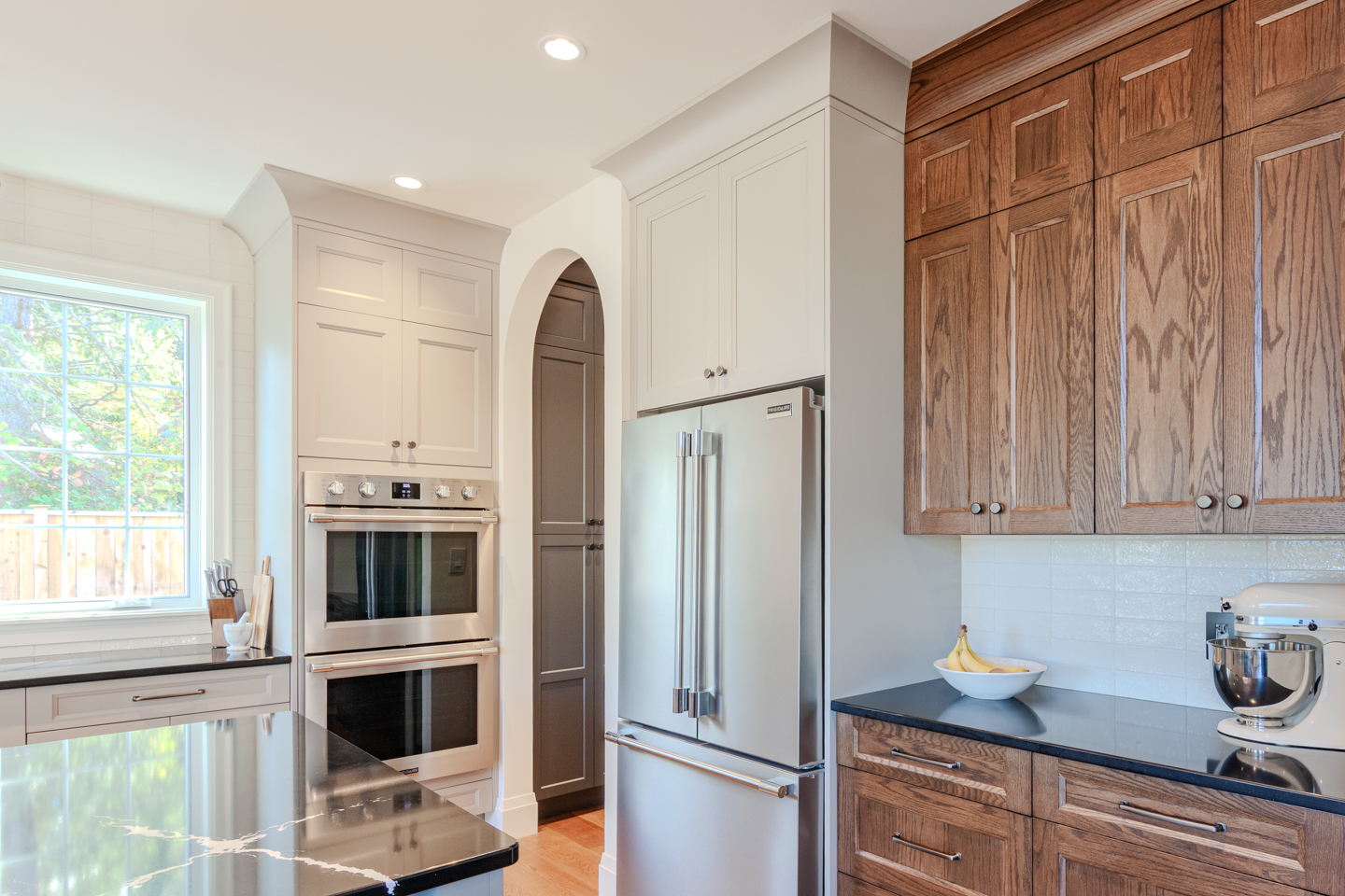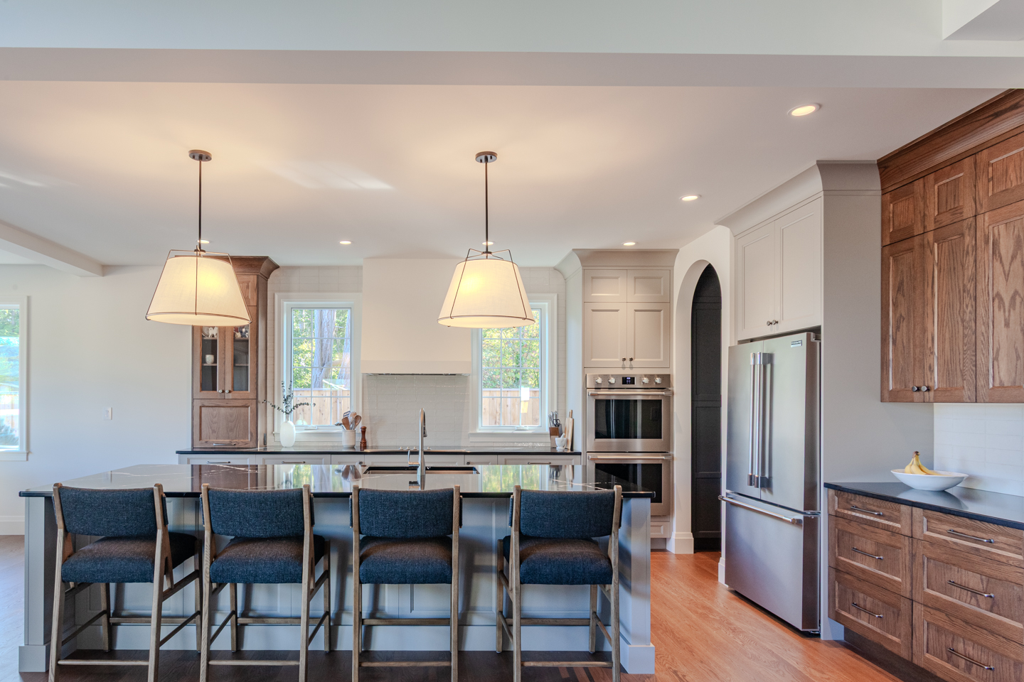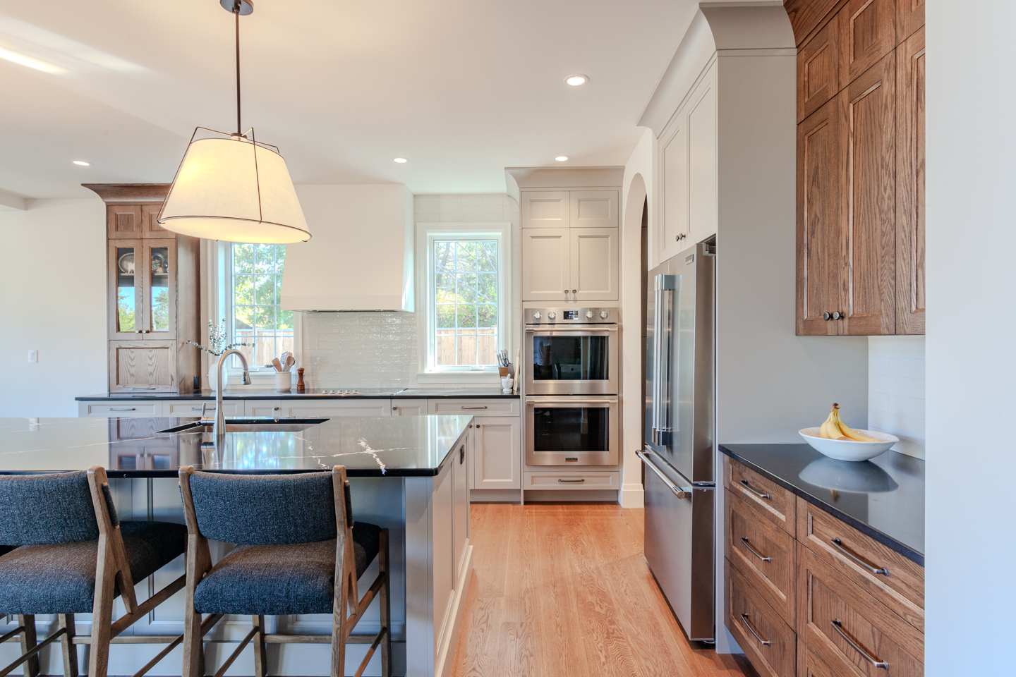 The inclusion of oak cabinetry introduces a touch of natural warmth without overwhelming the overall aesthetic. By extending the cabinetry to the ceiling, we maximized storage while also defining the kitchen as a distinct area within your custom open-concept home.