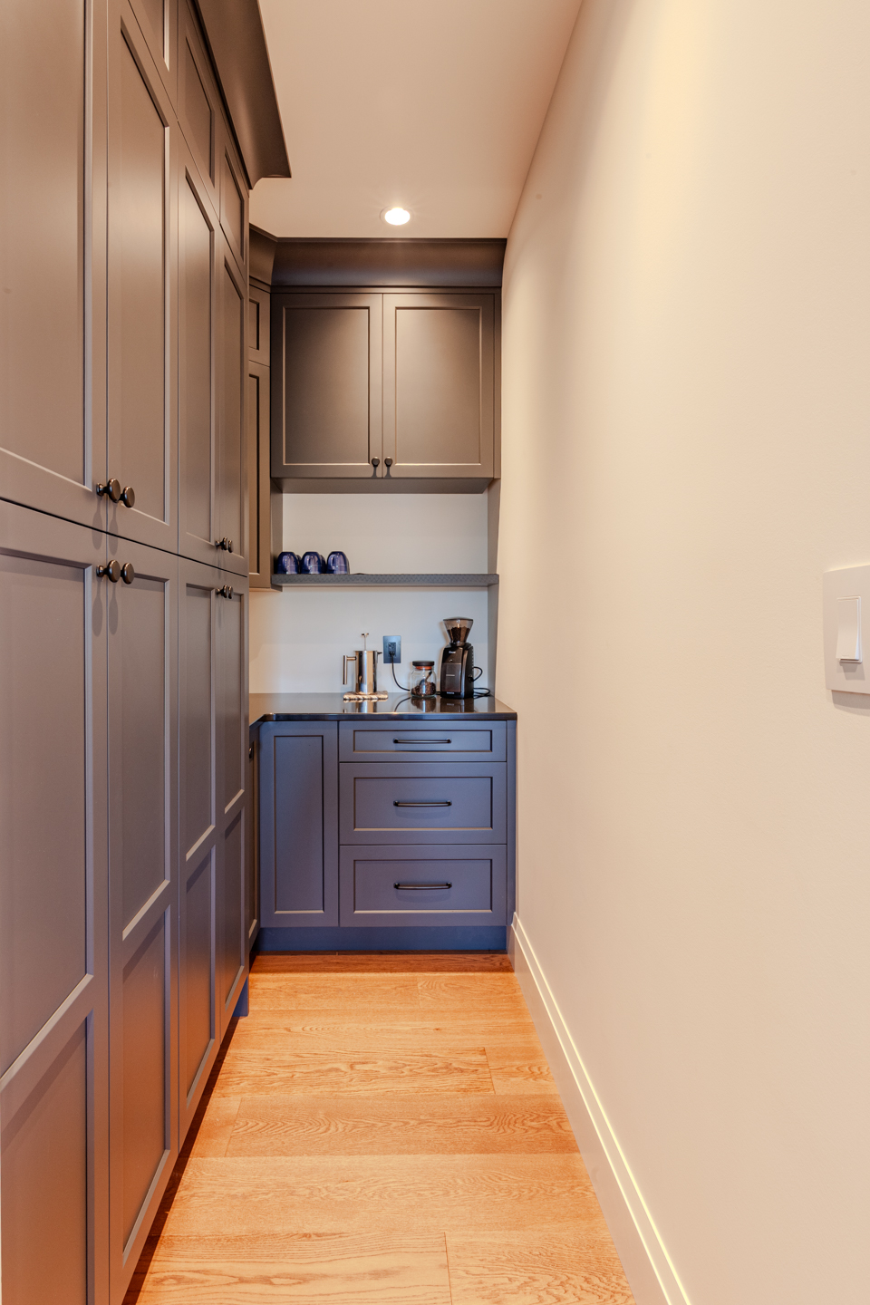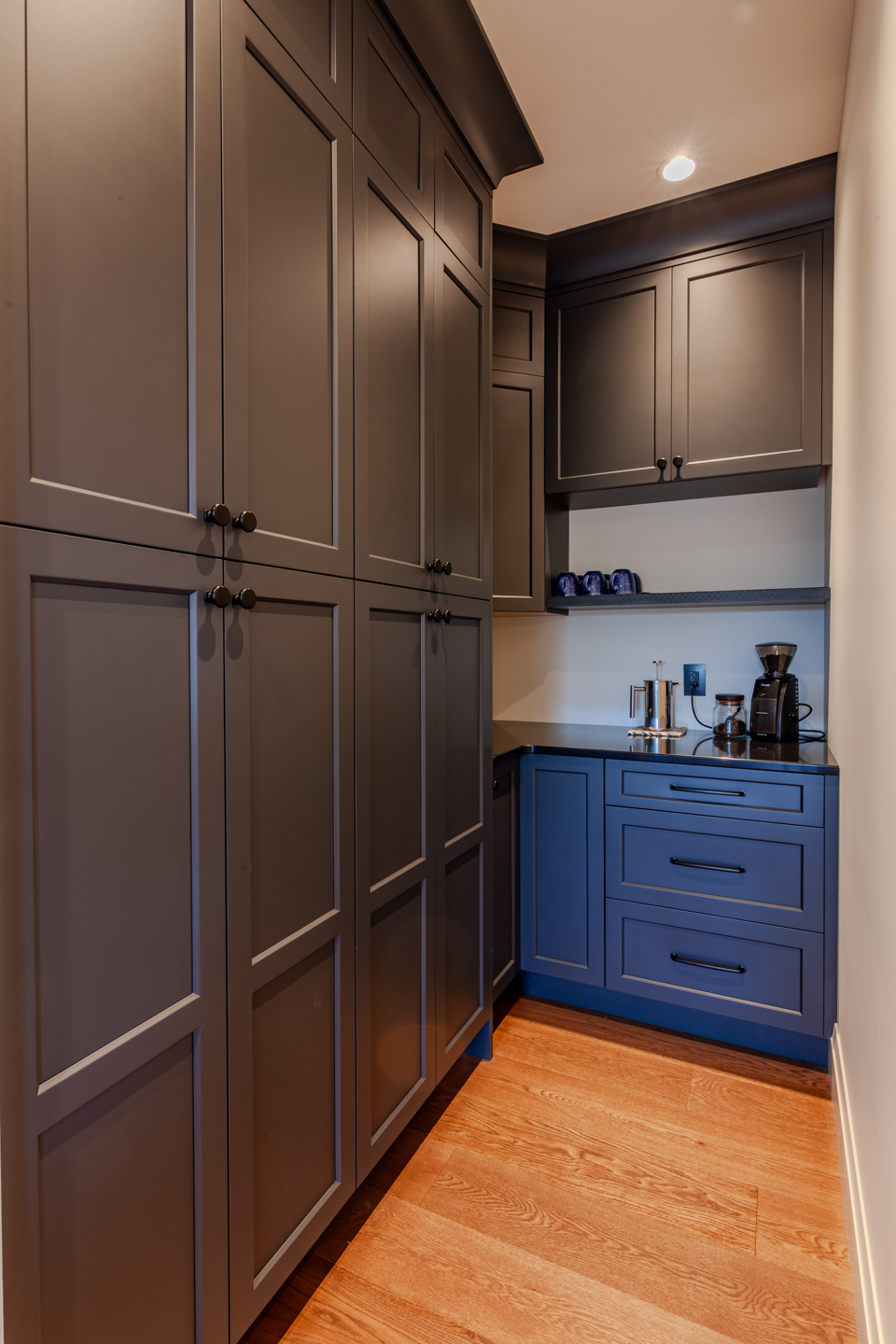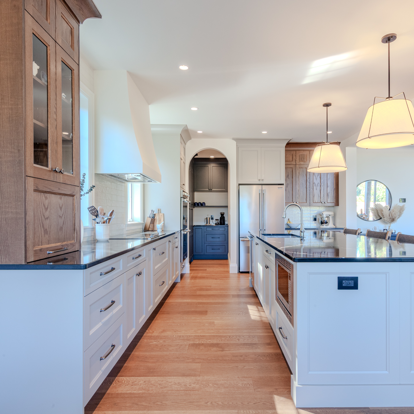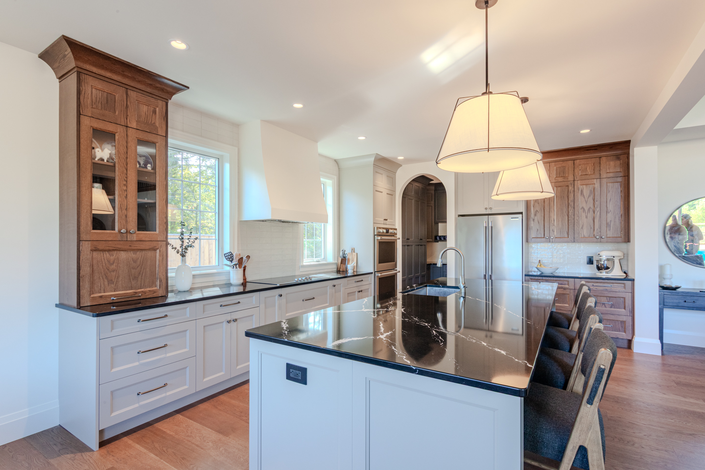 Perimeter: Merit “Lonsdale” solid maple doors painted haze & Sepia Stain on solid oak