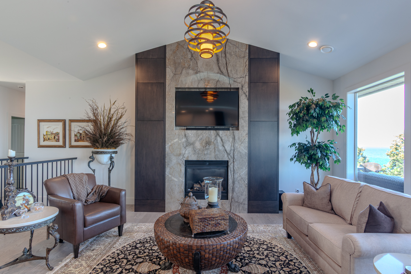 The fireplace design extends all the way to the ceiling and features a striking full-height column of natural granite, which also houses the TV.