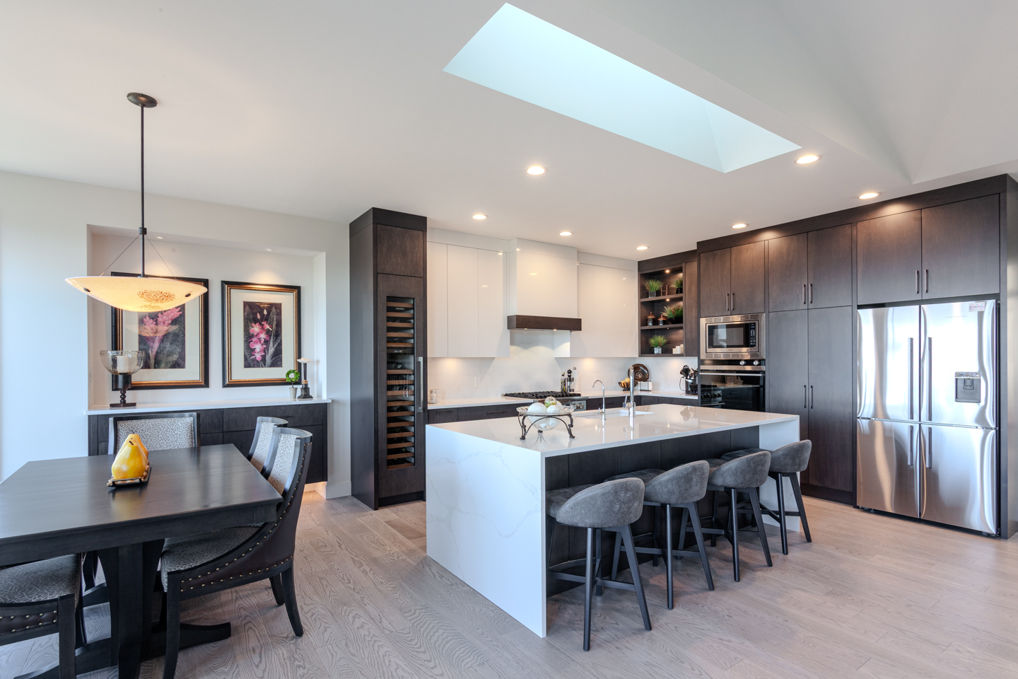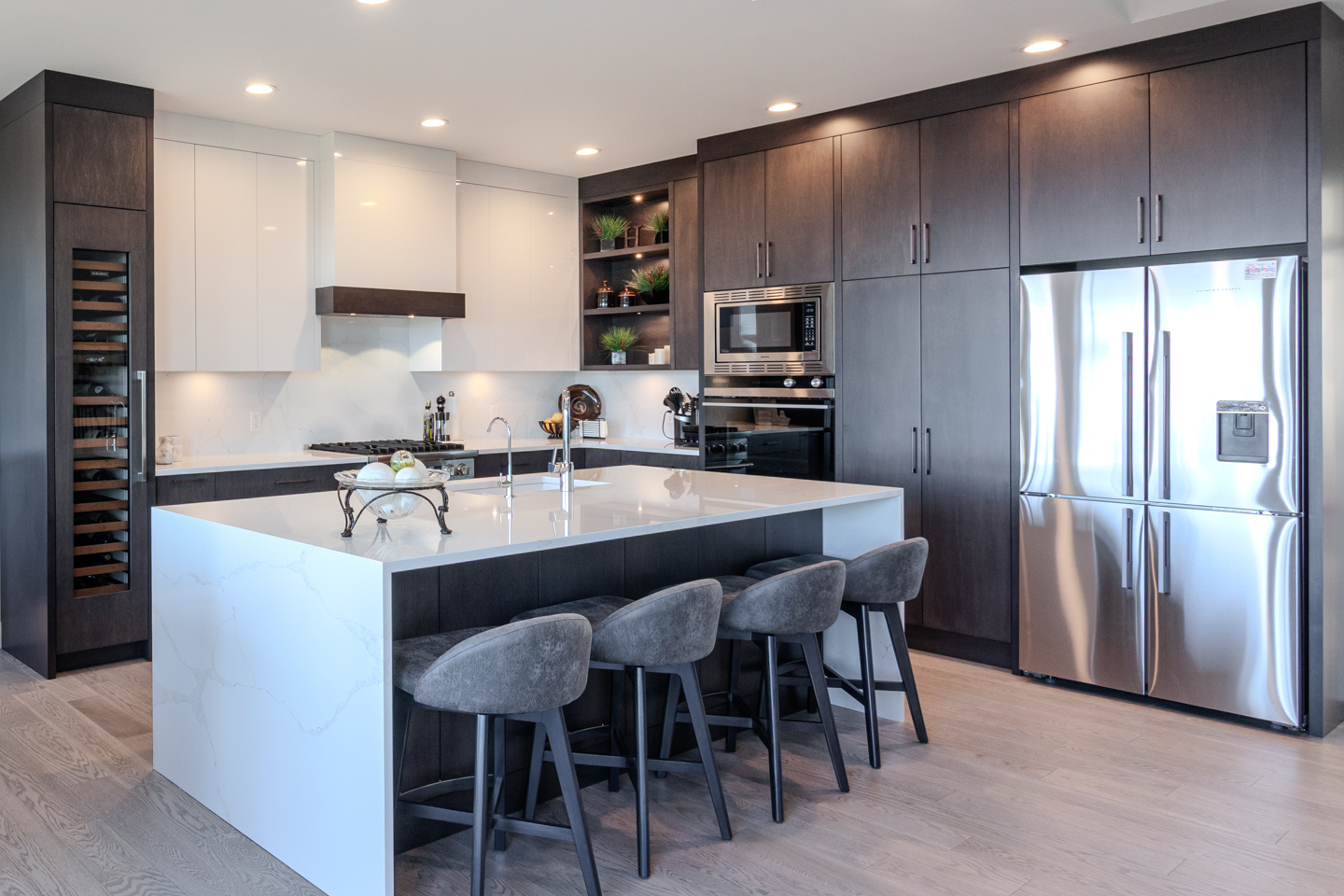 Built-In Appliances, Built-In Refrigerator, Custom Range Canopy, Granite, Island, Slab, Stained Maple, Waterfall Edge Quartz