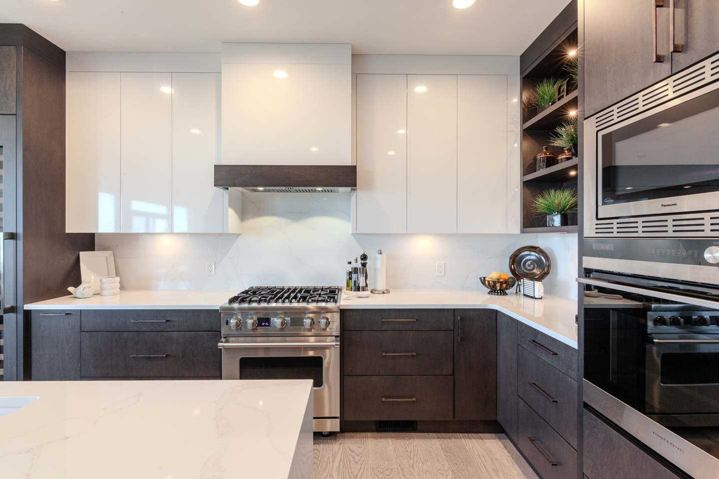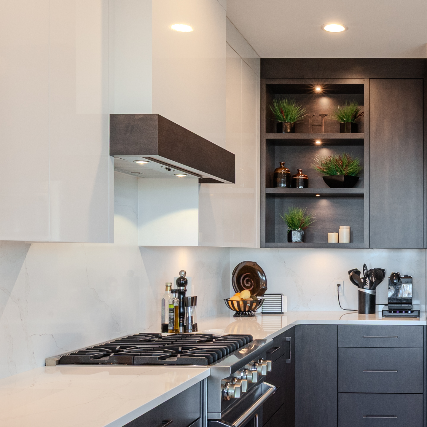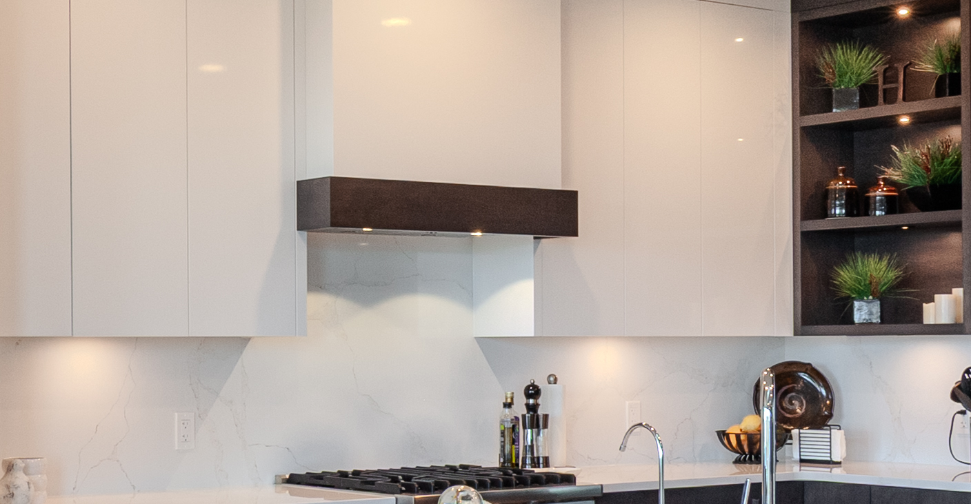 For the wall cabinets in the kitchen, we opted for a high gloss Frost paint. We incorporated an “invisible handle” design by extending the doors 1.75 inches below the cabinet case. To maintain a seamless look, we also finished the underside of these cabinets with high gloss panels.
